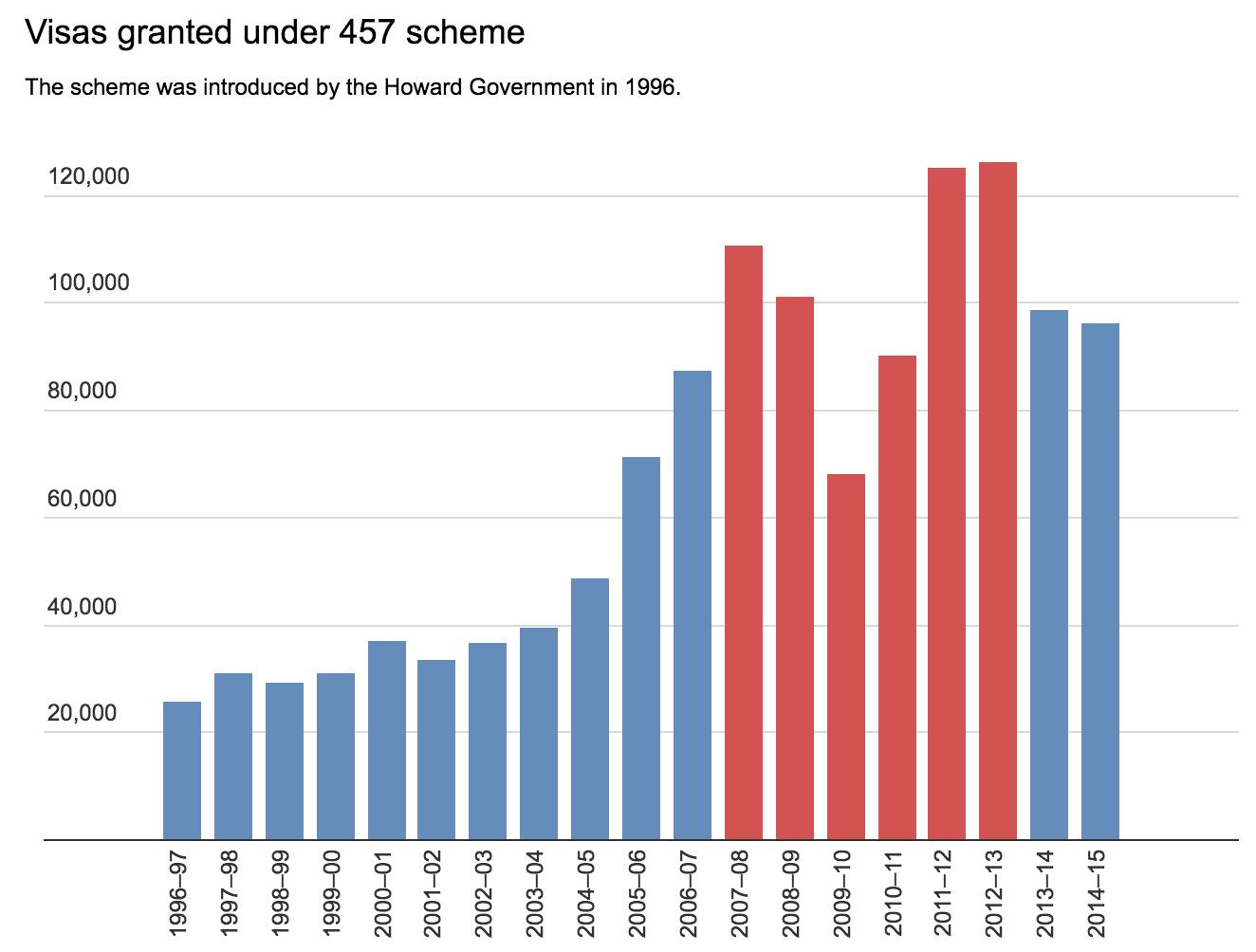 近来457雇主担保签证每年的签发量都在10-12万人左右,在不同行业中从事各种各样的工作。然而大量的457签证持有者也对澳洲本地人的就业造成了较大冲击。迫于保障澳洲本地人就业的压力,澳洲政府改革457签证的必要性与日俱增。甚至连反对党也在控制457签证的问题上对执政党表示了支持!
