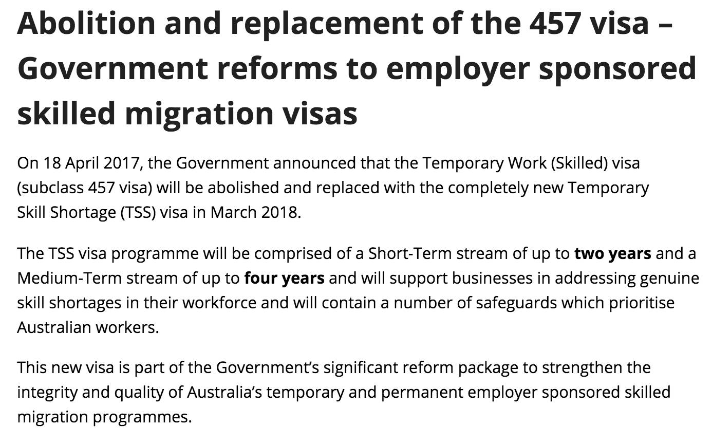 4月18日澳洲总理特恩布尔宣布了一条爆炸性的新闻,澳洲政府将废除实行了近20年的457雇主担保类签证!取而代之的将是全新的临时工作签证Temporary Skill Shortage (TSS) visa。除此之外,SOL与CSOL职业清单也遭全面大改,职位数量更少的MLTSSL与STSOL清单将取而代之,485 / 189 / 190 / 489 / 457 / 186 / 187等签证类别均受影响。
