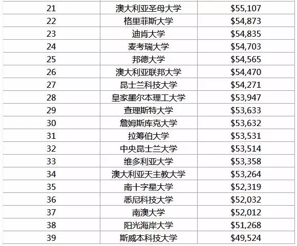 从澳大利亚39所大学的排行榜结果来看,西澳大学的毕业生薪金为全澳第一,塔斯马尼亚大学也凭借AUD$57,547 的毕业生起薪位列前十。其他大学,如卧龙岗大学,西悉尼大学在毕业生薪资排名中的表现也十分良好,分别排在澳洲39所院校的第6位和第9位。