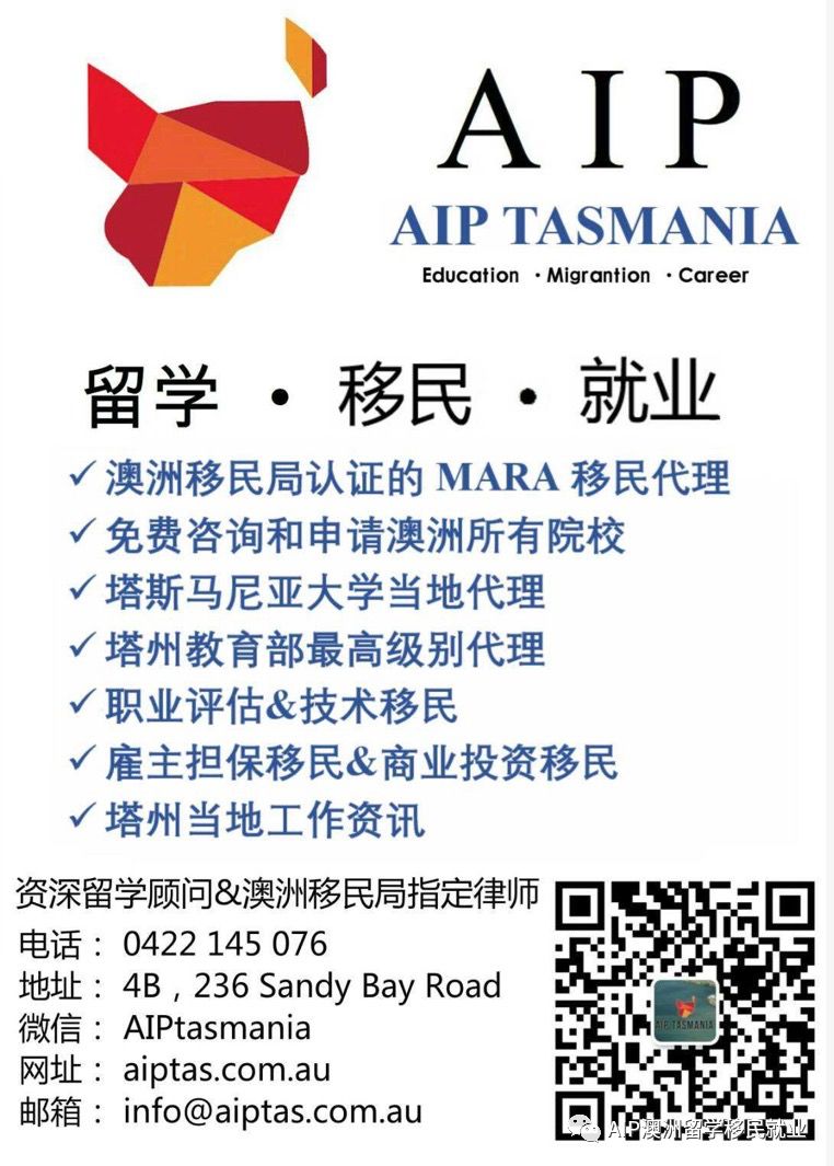 我们的团队都是经过专业培训, 并且充满正能量。 我们的企业文化是: “如果承诺了学生和客户, 那么就全力以赴; 如果不能,那么就不要承诺!” 地址:236 Sandy Bay Road, TAS, Australia 办公地点就在塔斯马尼亚大学附近! 电话:+61 422 145 076 网址: www.aiptas.com.au 留学移民咨询