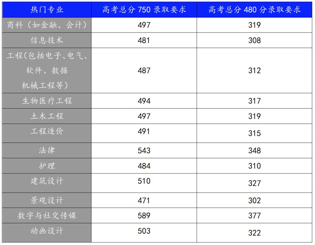 • 达一本低分线的同学,可入读大部分商科、传媒、教育、IT、设计等专业(详见Table 2);
