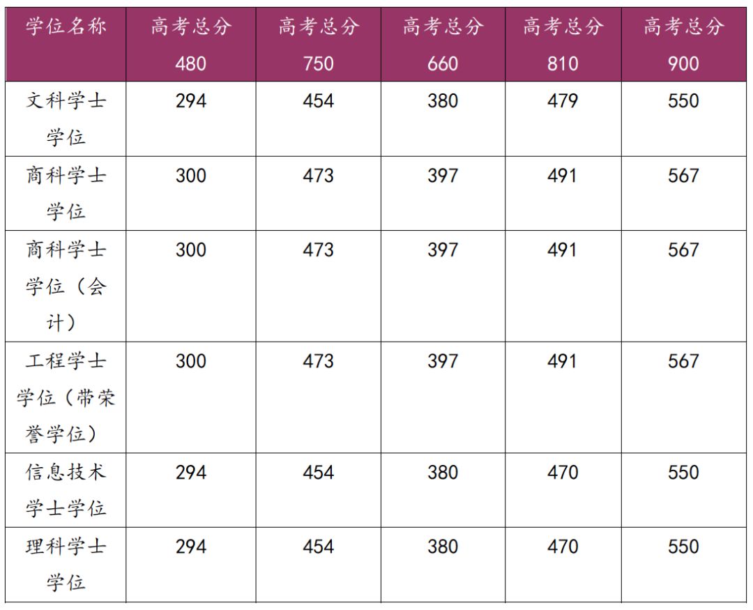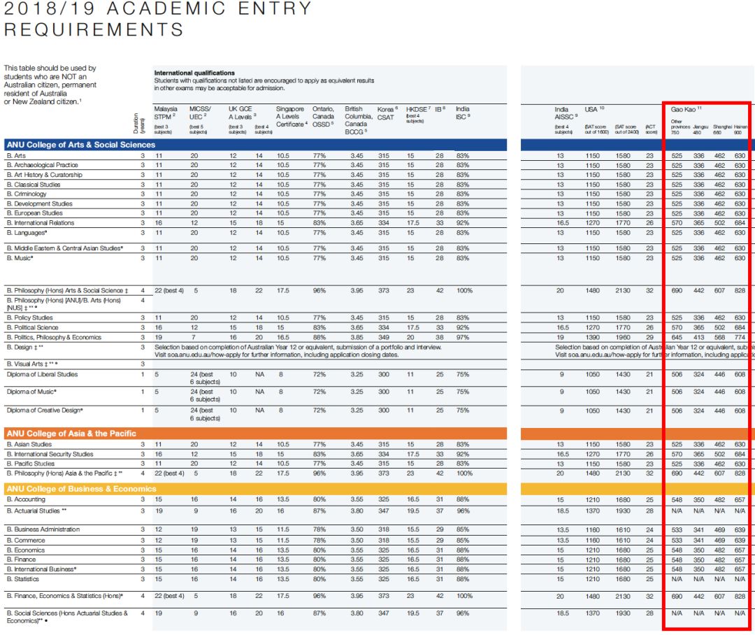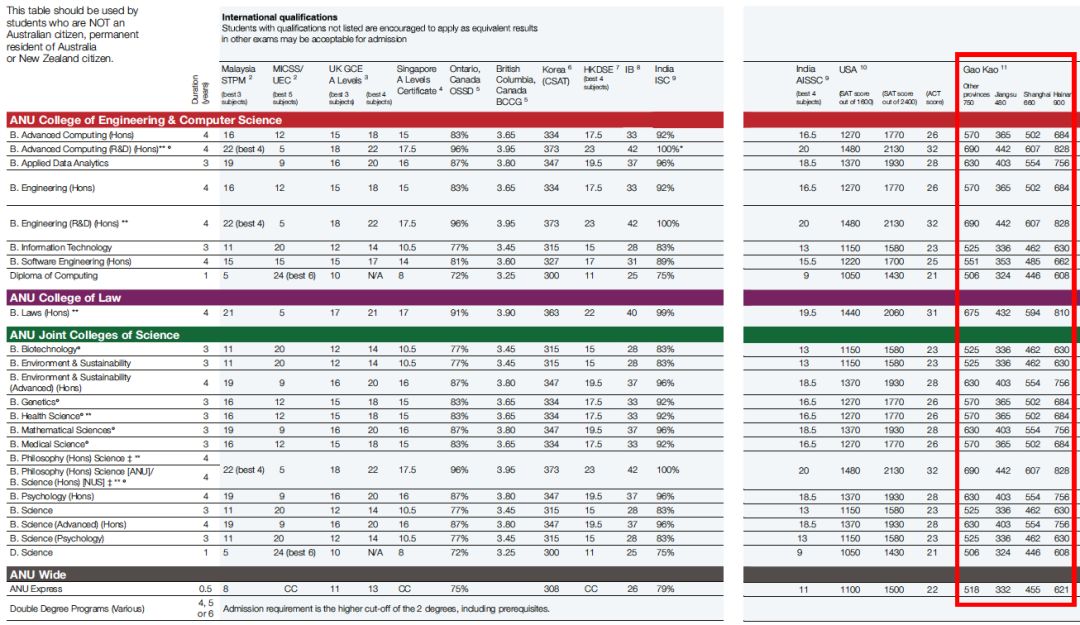 ANU对高考生的录取要求因专业而定,高考录取分数基本分布在525至690分之间(满分750),详情请点击查看下图: