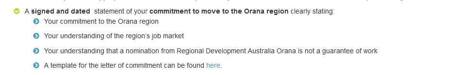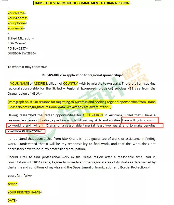 以新州orana地区为例,该地区要求申请人在申请489签证时,声明其下签后仍愿意在orana居住并且生活,具体可见下方的commitmentletter标红处。