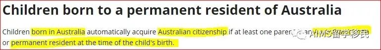 夫妻至少有一方为PR/Citizen, 小孩在澳洲出生, 可以自动获得澳洲国籍。