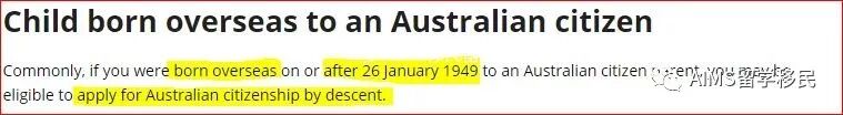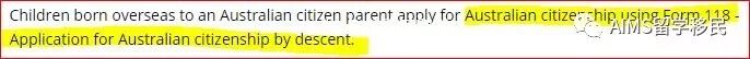 按照澳大利亚国籍法,1949年1月26日以后,夫妻有一方为澳洲国籍,孩子出生在澳洲以外的国家(比如中国),可以直接申请澳洲公民。只需填写118表格申请并递交给移民局即可。