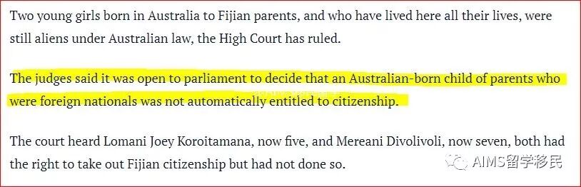 它的前提条件是在这十年内,孩子必须在澳洲有合法的签证并一直持续呆到10岁才能申请澳洲的国籍。  在2006年,在澳洲出生的2名小女孩由于父母在澳洲并无合法签证,因此小女孩们申告法院控诉自己的情况,想要因此获得澳洲国籍,最终被最高法院判决败讼,她们最后只能选择申请父母的原FIJI国籍。(下图来自澳洲NATIONAL新闻网)