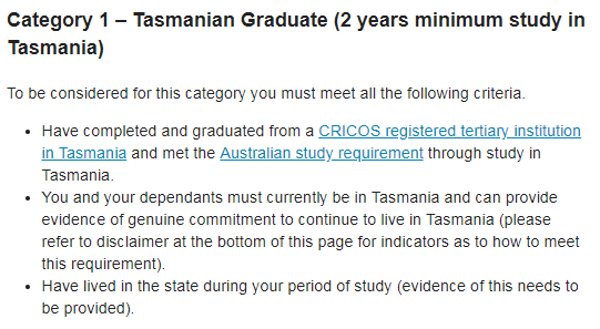 反观塔州190州政府担保移民的政策,特别是塔州190的毕业生类别(Category 1 – Tasmanian Graduate,见下图),你只要满足技术移民的基本申请条件,在塔州读完2年的CRICOS注册的课程且读书期间在塔州定居即可满足塔州190的州担保条件!