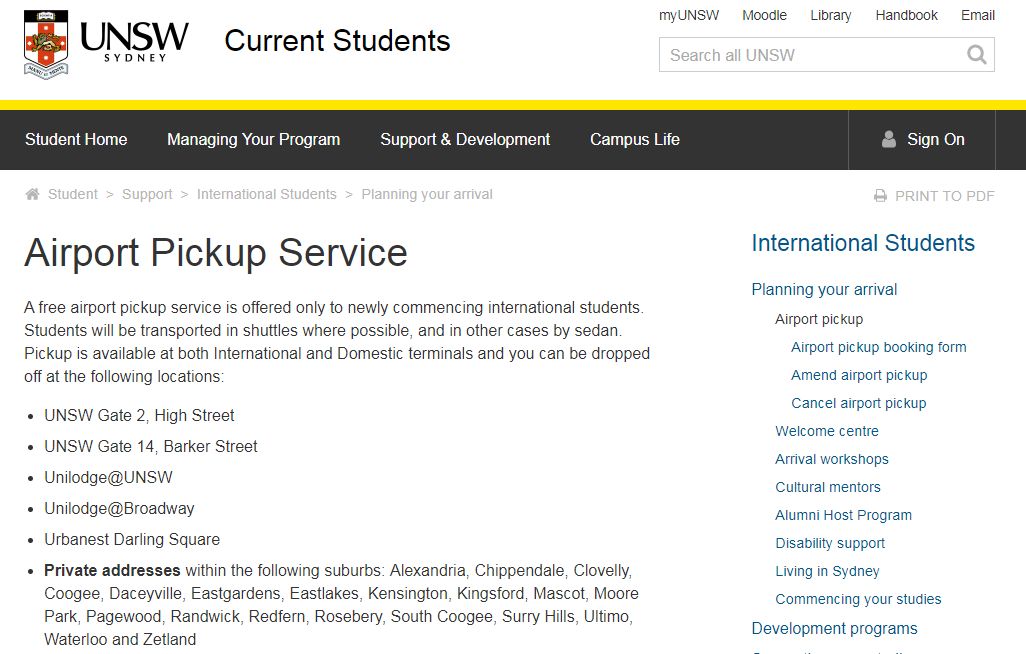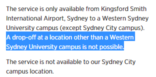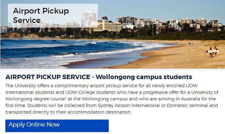 需要注意的是,你必须在达到前的72小时预订,周末达到的学生必须在周四下午4点前预定。与前面几个大学的接机服务不同,伍伦贡大学的免费接机服务除了对本科或研究生开放,还对预科生、快捷课程学生、语言班学生免费开放!