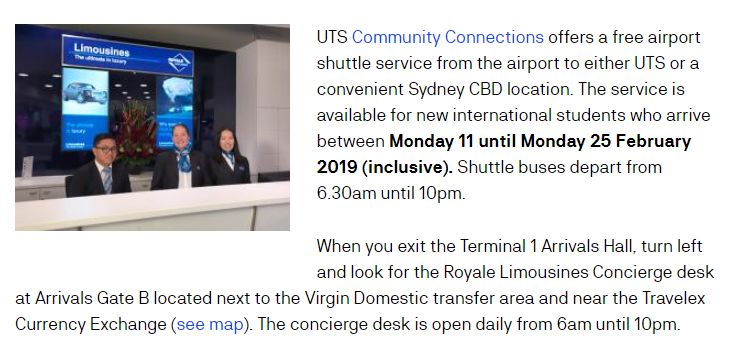悉尼科技大学的新生免费机场接机服务由UTS Community Connections部门提供,凡在2019年2月11日至2月25日,早6点半到晚10点之间到达的国际新生均可享受这项服务。