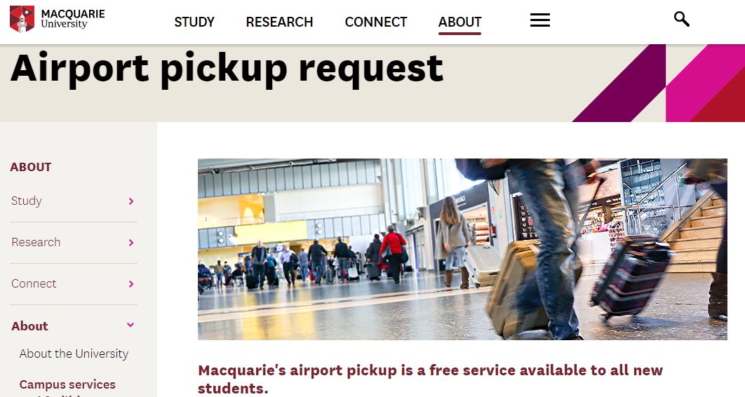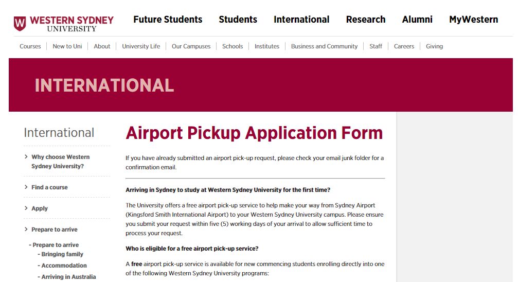 西悉尼大学为首次入学的国际学生提供免费接机服务,大家至少需要提前5个工作日提交接机申请。需要注意的是,接机司机在航班降落后的1个半小时内都会机场大厅里的麦当劳等候你,请在出关后尽快前往该地点并与司机汇合。
