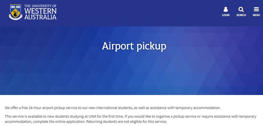 西澳大学的国际新生接机服务非常霸气,全天24小时、国际或国内航站楼都可以接!需要特别注意的是,你必须至少提前7天预订西澳大学的接机服务,如果你的航班信息有变,必须提前72小时告知学校。