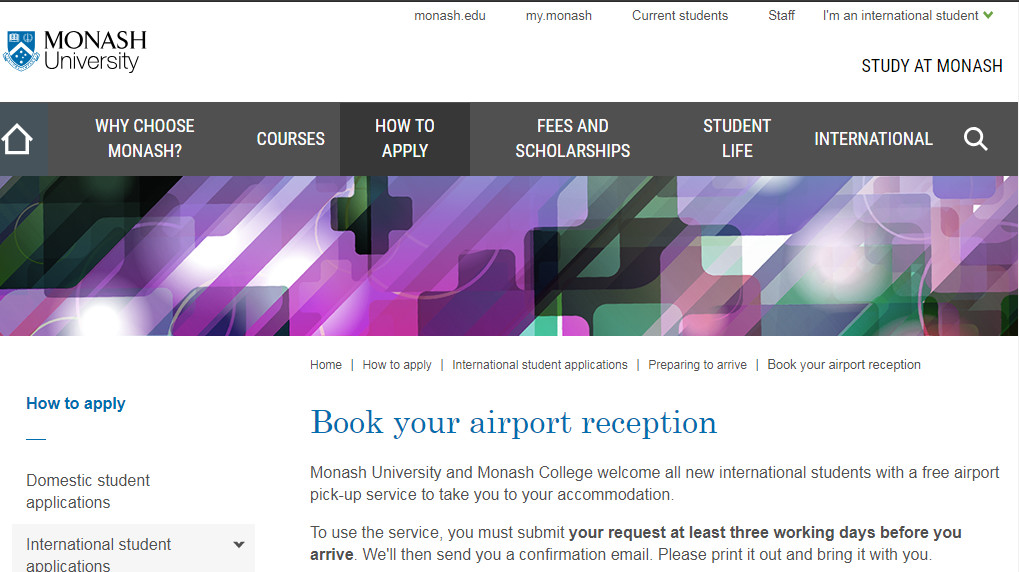 7. Monash University 蒙纳士大学 地处墨尔本的蒙纳士大学同样为国际新生提供免费的机场接机服务,蒙纳士大学以及蒙纳士学院的学生均可享受这项服务,但必须至少在达到前的3个工作日递交申请。