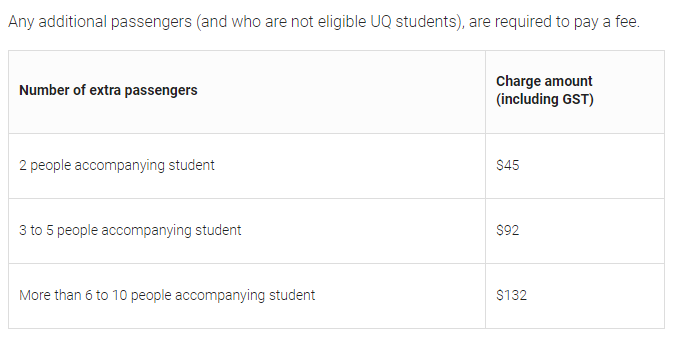 同在昆士兰州的格里菲斯大学也为各位国际新生提供免费接机服务,且接机范围涵盖布里斯班机场与黄金海岸机场。请注意,请至少在起飞前72小时提前预订。此外,格里菲斯学院的同学也可预订接机,但需要支付一定费用,详见下表: