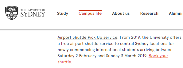 悉尼大学从2019年开始首次为所有国际新生提供免费的接机服务!只要你是在2019年2月2日至3月3日之间到达的悉大新生,均可提前预订这项福利哦!你只需在到达前,至少提前3个工作日将自己的航班、学号,还有目的地地址填入申请表并递交即可。